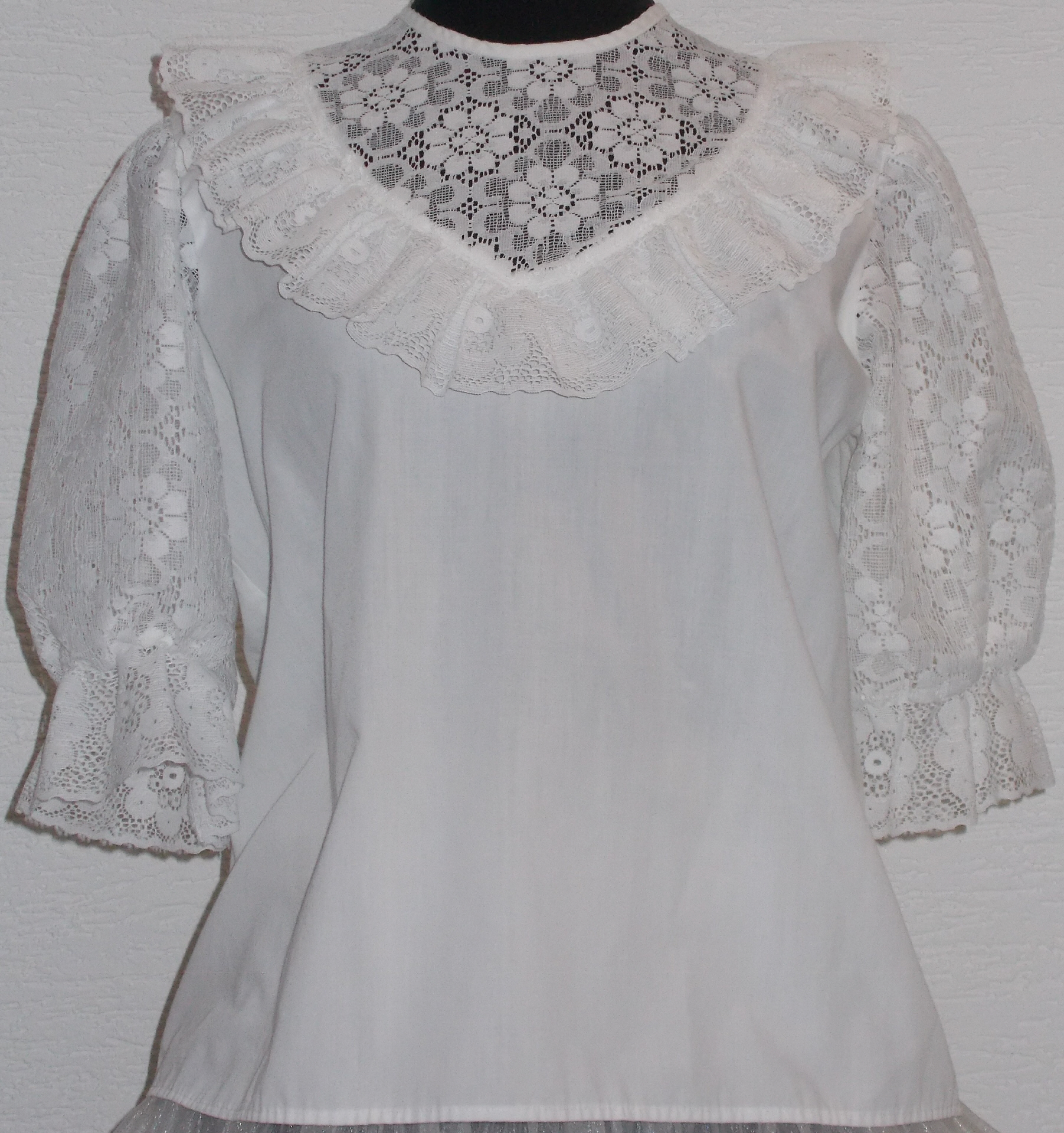 weisse Bluserunder Halsausschnitt mit Spitzeneinsatz, verziert mit 6 cm Spitzenvolantkurze Puffärmel aus Spitze mit 7 cm Volanthinten 32 cm ReisverschlussTOP Zustand!