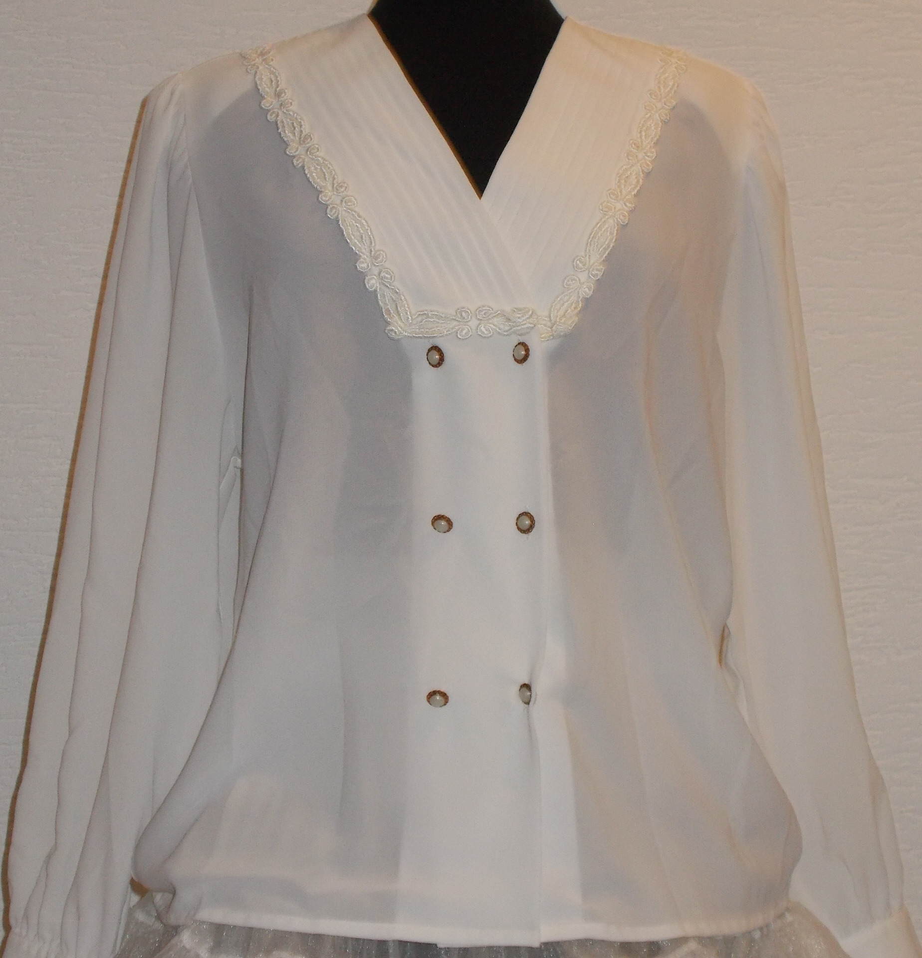 V-Ausschnitt mit 9-fach Biesen verziert, das ganze krönt eine edle 2 cm breite Spitze die Bluse ist im Vorderteil doppelt geknöpft mit 6 Knöpfen, perlförmig mit Goldkranz die Bluse hat leichte Schulterpolster und lange Ärmel in der Länge von 63 cm