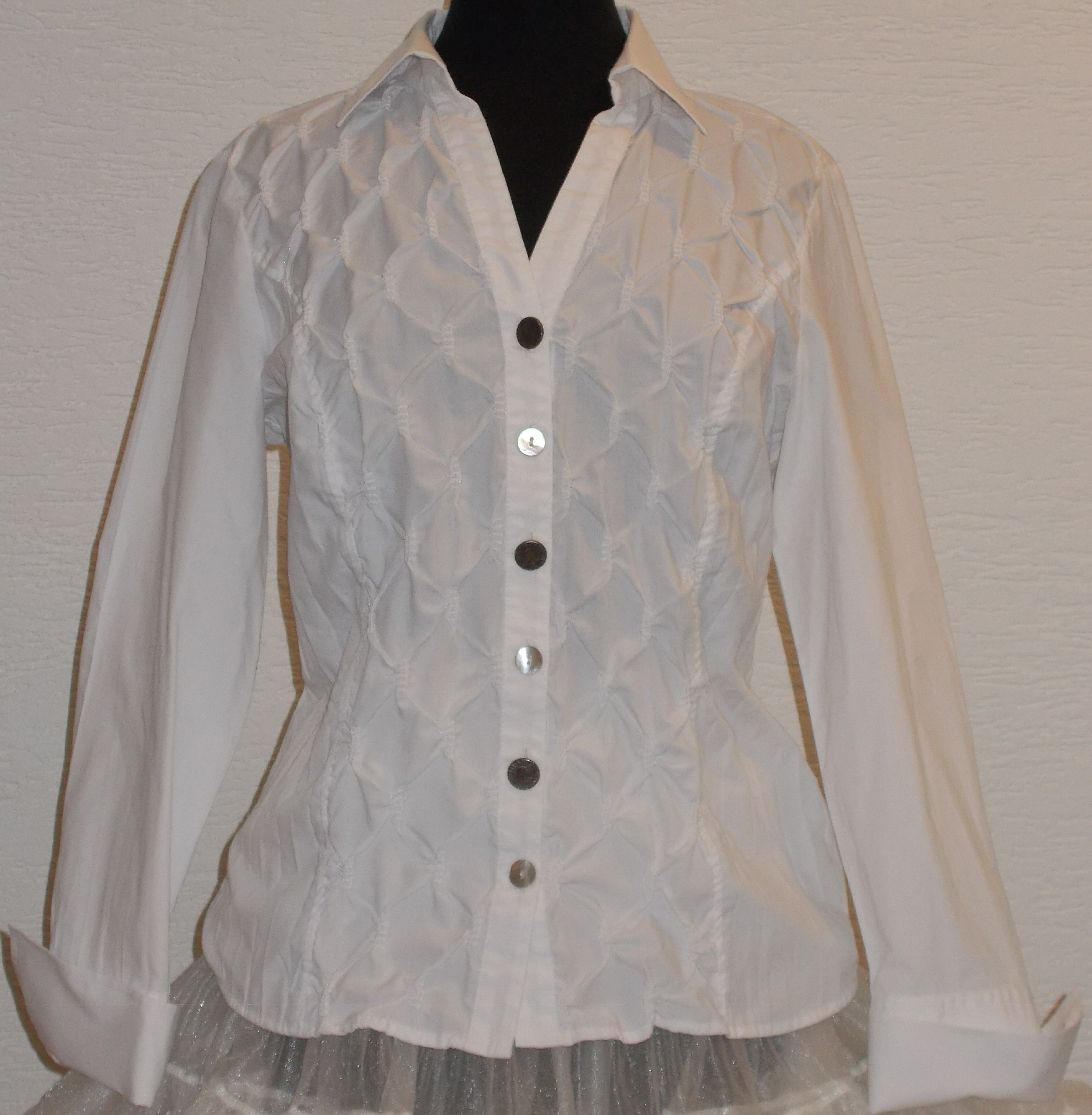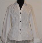 weisse Bluse Gr. 38V-förmiger Halsausschnitt, vorne geknöpftvorne rautenförmig gerafftes Musterabwechselnd Knöpfe Perlmut und MünzenLangarmbluse mit Manschette und einer Länge von 55 cm Material: 65% Polyester35% CottonTOP Zustand!