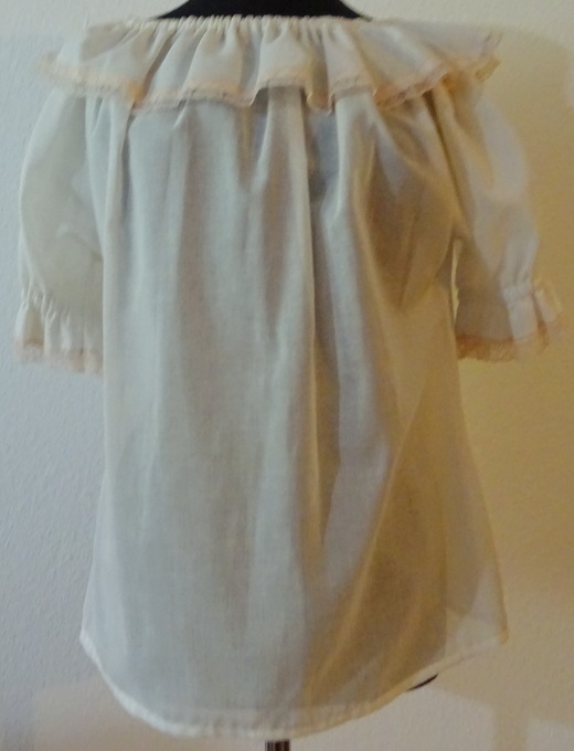 zartbeigefarbene Blusehalbrunder Halsausschnitt mit Gummizug, das 10 cm Volant ist mit dunkelbeiger Spitze verziert27 cm kurze Puffärmelchen mit Gummibund und ebenfalls dunkelbeiger Spitze verziertMaterial:MischgewebeNEU