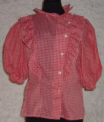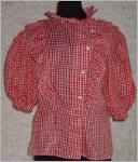dürfte Grösse S seinFarbe rot/weiss kariertPuffärmel und StehkrägelchenVorderseite mit 2-bahnig Rüschchenschräg geknöpft