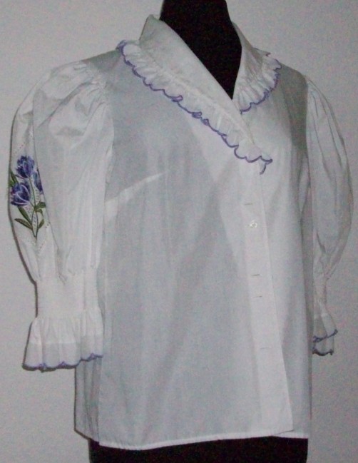 weisse Bluse mit aufwändiger Stickerei Grösse 36 V-Ausschnitt mit 3 cm Volant (lila eingekordelt) vorne geknöpft auf den Puffärmeln Stickerei Blüten in 2 Lilatönen und Blätter in grün umrankt mit Lochstickerei breite Gummifassung 7 cm breiter Volant (lila eingekordelt)