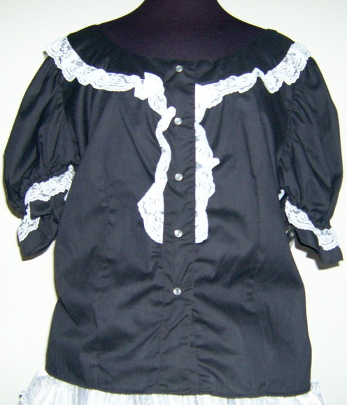 SchwarzGrösse XLrunder Halsausschnittweisse Spitze am Ausschnitt, den Ärmelchen und der Knopfleiste5 weisse Perlmutt-DruckknöpfeNeu 50% Polyester. 50% Cotton