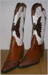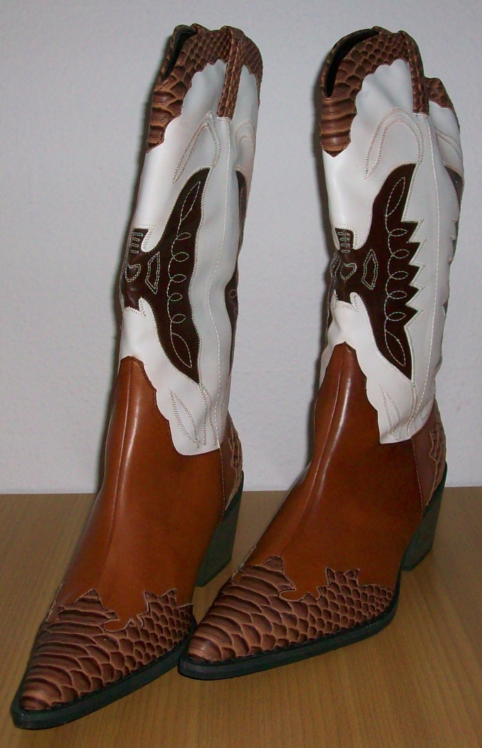 Farbe weiß/braunreich verziert mit Applikationen.Schafthöhe ca. 27 cmAbsatzhöhe ca. 6 cmKunstleder, Sohle gummiertLieferbare Größen: 1 x 38 (fällt klein aus)