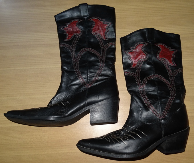 Farbe schwarzverziert mit roten Ornamenten und StickereiSchafthöhe: ca. 30 cmAbsatzhöhe: 5,5 cm KunstlederAbsätze sind neu besohlt!Größe: 38 sehr guter Zustand