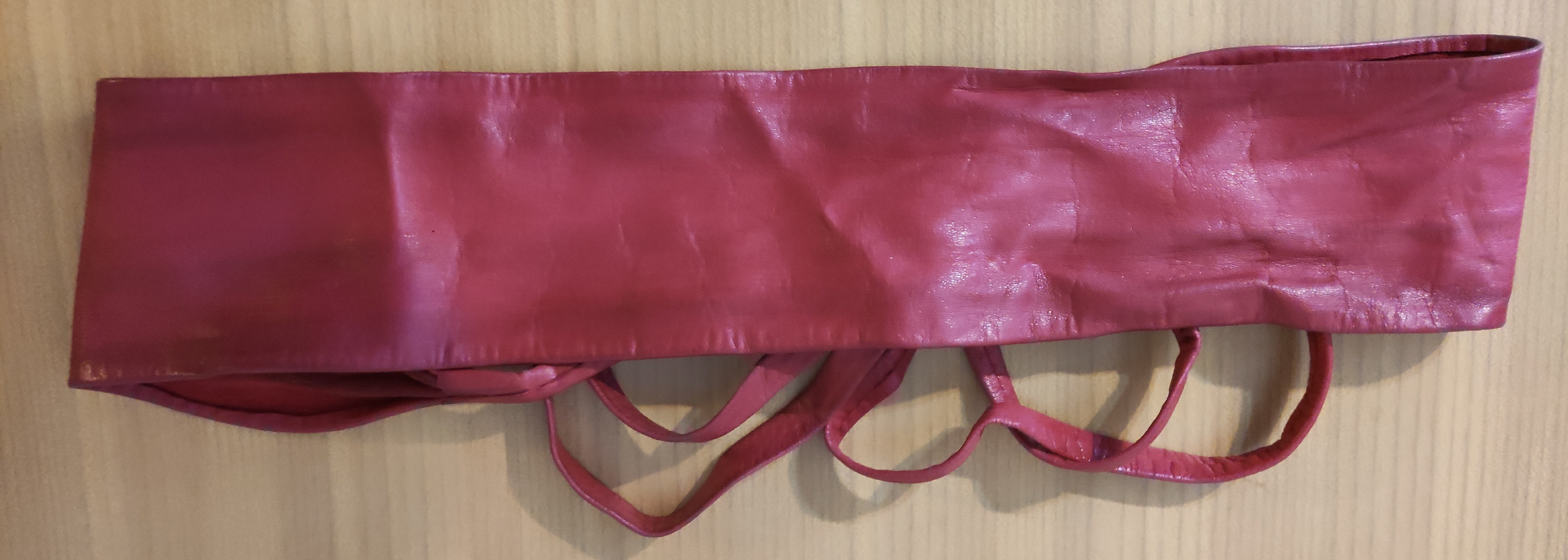 Damenbindegürtel aus sehr weichem rotem Leder. Der Gürtel hat zwei Bänder mit denen er individuell geknüpft werden kann. Gürtellänge: 67cm Bänderlänge: 138cm