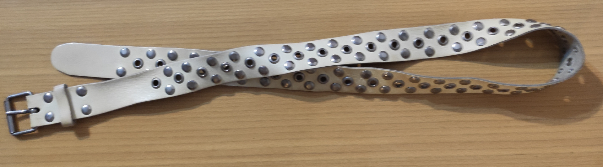 cremefarbener Ledergürtel mit sehr vielen silberfarbenen Nieten und silberfarbener Schnalle Durch Nieten beliebig verstellbare Länge Breite: 3 cm Länge: max. 87 cm guter Zustand