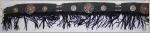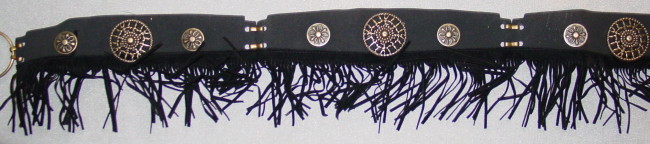 schwarzer Kunstledergütel mit Fransenvorne zu binden mit langen Kunstlederstreifenverziert mit 3 grossen, goldfarbenen, durchbrochenen Conchas und 6 kleinen Conchas mit BlütenmusterNeu
