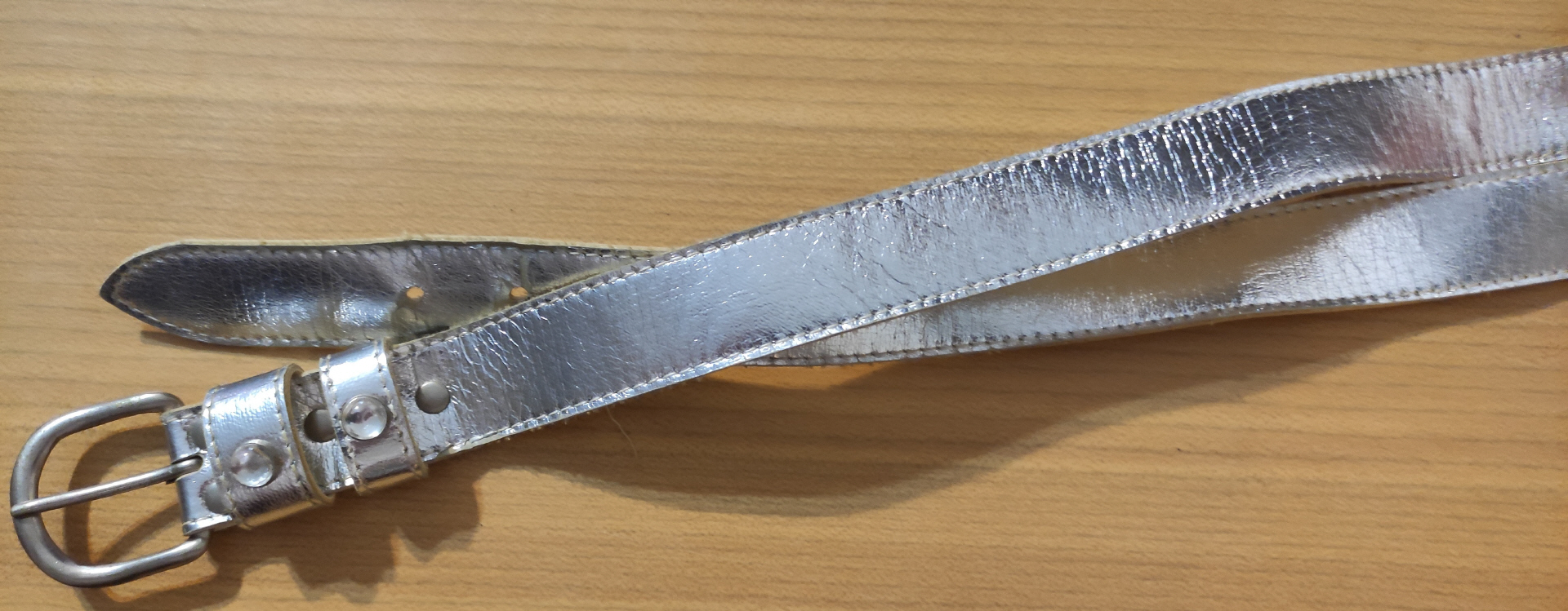 silberfarbener Kunstledergürtel auf den beiden gürtelschlaufen befindet sich jeweils ein strasstein Maße: Breite: 3 cm Länge: 71 cm bis 84 cm