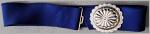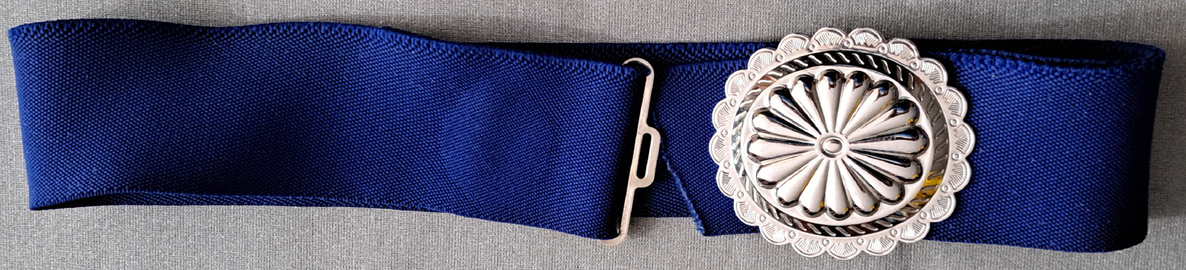 Royalblauer Stretchgürtel mit ovaler silberfarbener Schliese mit Ornamenten.beliebig enger zu machenSchliese 7 cm x 6,5 cmBreite: 5 cmLänge: max. 78 cm