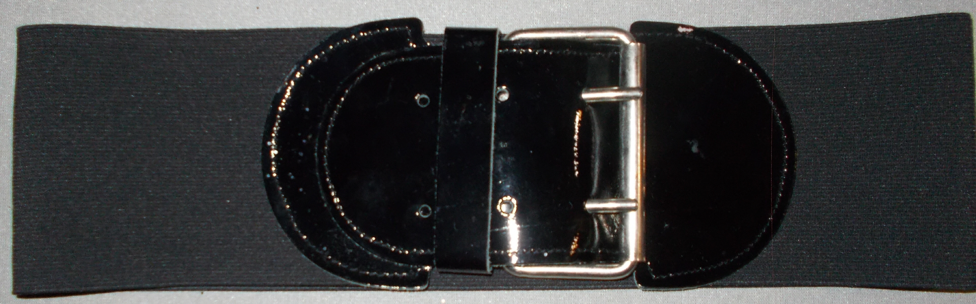 schwarzer Stretchgürtelvorne 20 cm schwarzer Lackledereinsatz und massive silberfarbene Schließekürzestes Loch: 68 cm, 71 cm, 74 cmguter Zustand!
