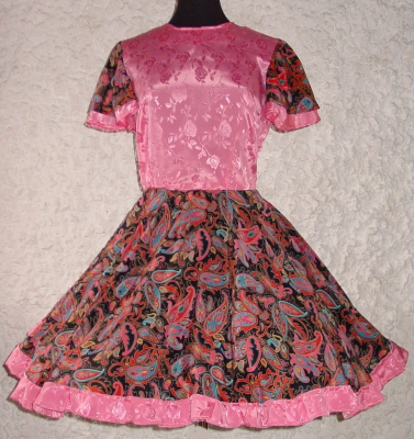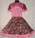 Oberteil rosa Jacquard Rosenmuster die kurzen, weiten Ärmelchen sind zur Hälfte aus Jacquard und Material des Rockes hinten 54 cm Reissverschluss eng anliegender Rundausschnitt Rock schwarzgrundig mit grossen Ornamenten in blau/rosa/ocker/rot der Rock schliesst ab mit einer 5 cm breiten Rüsche in Jacquard-Muster