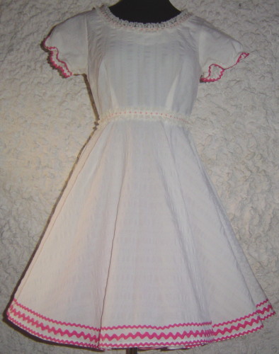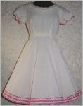 weisses Kleid aus pflegeleichtem, leicht strukturiertem Stoff hinten 42 cm Reissverschluss 16 cm kurze Ärmelchen mit Gummizug gesäumt mit pinkfarbener Zick-Zack-Litze runder Halsausschnitt, der mit beiger Spitze mit pinkfarbenen Pünktchen umrandet ist um die Taille die gleiche Spitze wie am Halsausschnitt weiter Tellerrock am Saumende drei Borten pinkfarbene Zick-Zack-Litze zwei schmale (wie an den Ärmelchen) in der Mitte eine doppelbreite