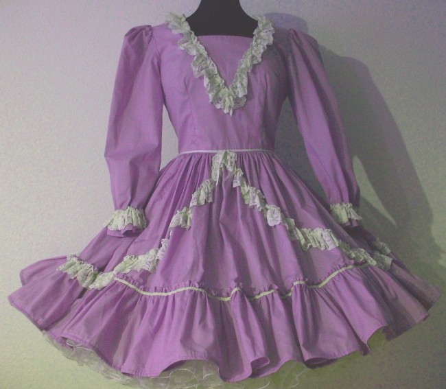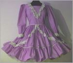 fliederfarbenes Kleid mit viel cremefarbener SpitzeOberteil gefüttertlange Ärmel (55 cm)hinten 44 cm Reissverschlussweiter Tellerrock mit 18 cm Volant