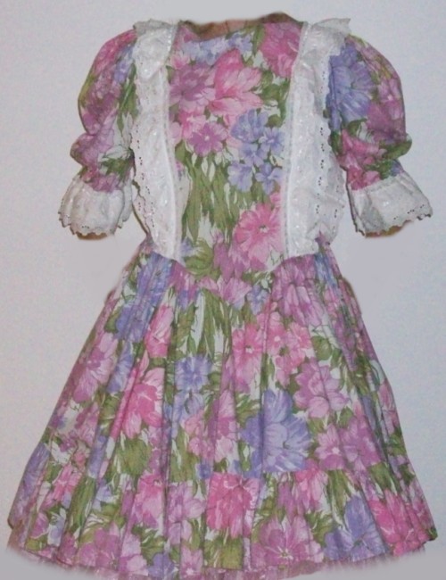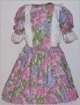 Kleid mit grossen Blüten in rosa, pflaume und flieder und grüne Blätter runder Halsausschnitt das Oberteil verläuft zum Rock hin als Spitze vorne und hinten mit doppelter weisser Spitze mit Lochstickerei verziert Puffärmel in der Länge von 38 cm ebenfalls mit weisser Spitze verziert hinten 38 cm Reissverschluss sehr weiter Tellerrock unten 13 cm Volant