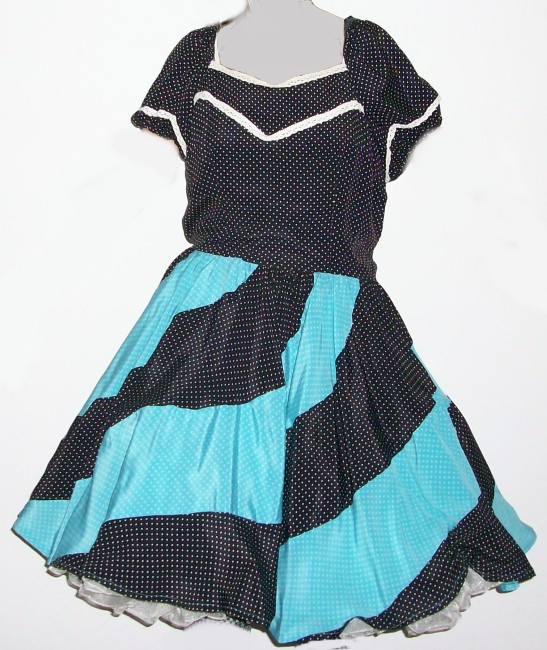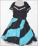 Farbe schwarz und hellblau mit weissen Tupfenverziert mit weisser Spitzekurze Puffärmelchender Rock ist in Bananenbahnen geschnittenhinten 34 cm Reissverschluss