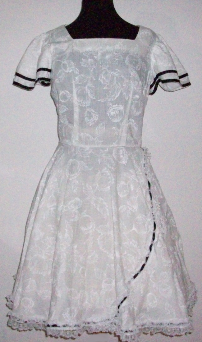 weisses Kleid, in sich strukturiert mit grossen, weissen Blüten viereckiger Halsausschnitt hinten 49 cm Reissverschluss kurze Flatterärmelchen (Stoff liegt doppelt) mit jeweils schwarzem Satinband verziert weit schwingender Tellerrocvk vorne schräg verlaufende 6 cm breite Spitze, die mit schwarzem Satinband durchzogen ist das Saumende ziert die gleiche Spitze