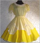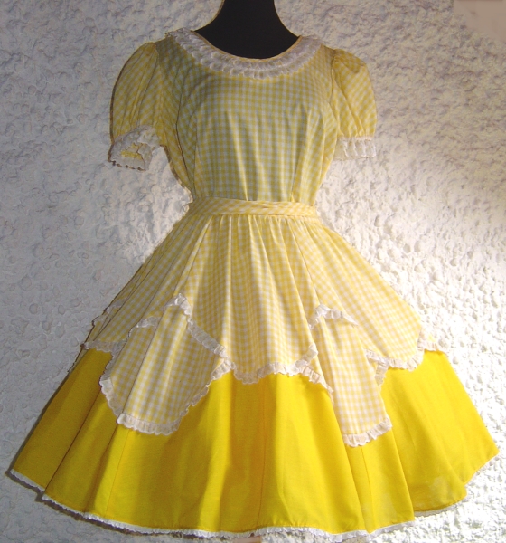 Farbe gelb/weiss kariert Reissverschluss im Rücken (50 cm) kurze Ärmelchen weisse Spitze Bindegürtel aus gleichem Stoff kann wahlweise vorne oder hinten gebunden werden