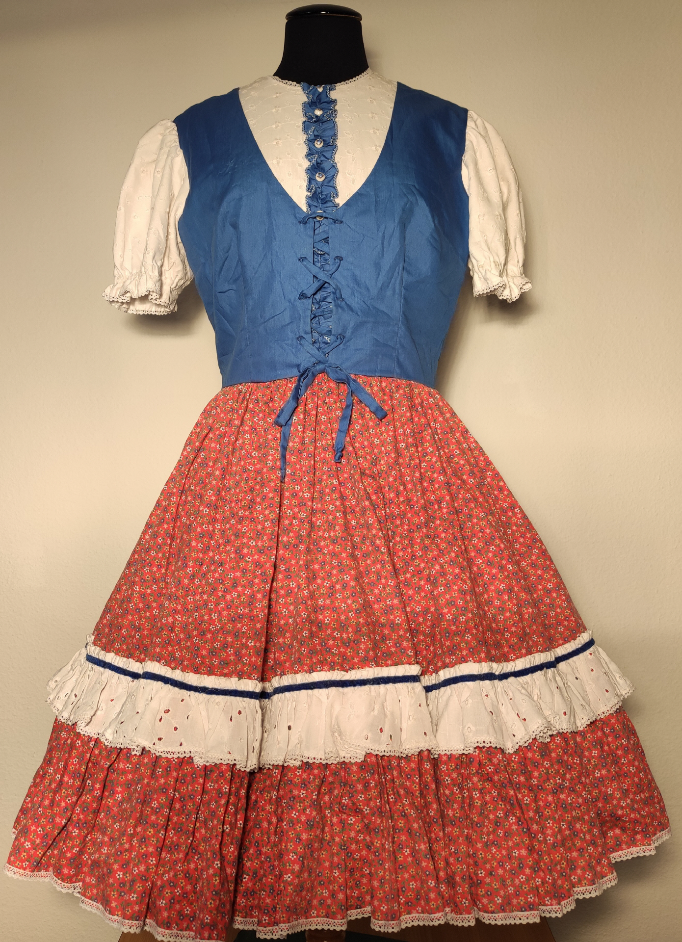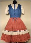 sehr weitschwingender Rock mit 20cm Volant verziert mit weisser Spitze, darüber noch ein Volant aus dem weissen Stoff Lochstickerei in 8cm Länge