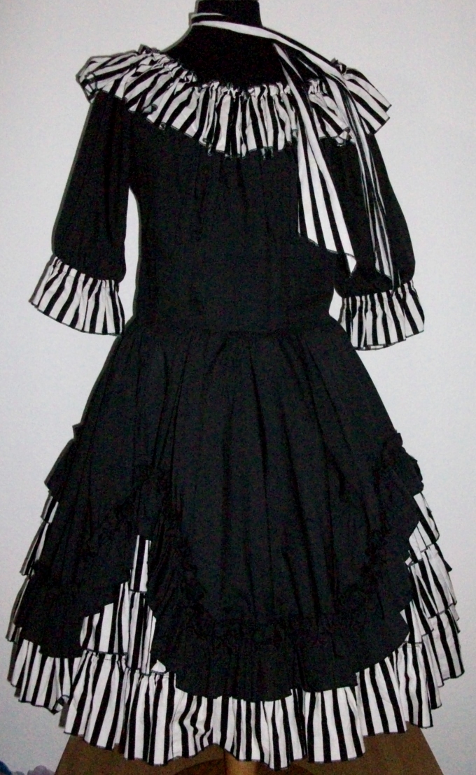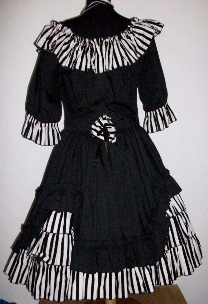An den Seiten 4-stufiges Volant: oberstes Volant in schwarz - 9 cm darunter 3-fach schwarz-weiß Voolant in je 12 cm vorne 2-fach Voolant schwarz und schwarz-weiss