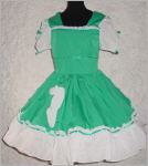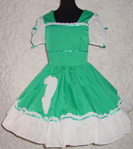 türkisfarbenes Kleid mit weissen Puffärmeln, weissem Volant und weisser Applikation (Umriss von Florida) die Ärmel aus weisser Lochstickerei, verziert mit türkisfarbenem Satinband haben an der Armoberseite einen Schlitz, was dem Kleid eine attraktive Note gibt hinten 45 cm Reissverschluss das 16 cm breite Volant am Saum des Rockes ist ebenfalls aus weisser Lochstickerei, verziert mit 5 cm langer Rüsche und türkisfarbenem Satinband
