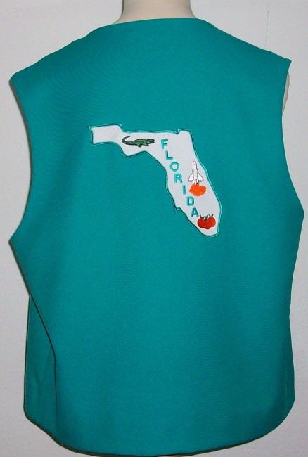 auf dem Rücken ebenfalls eine Applikation (Florida) mit aufgesticktem Schriftzu Florida, 3 gestickte Orangen, 1 gesticktes Space Shuttle und 1 gestickter Alligator