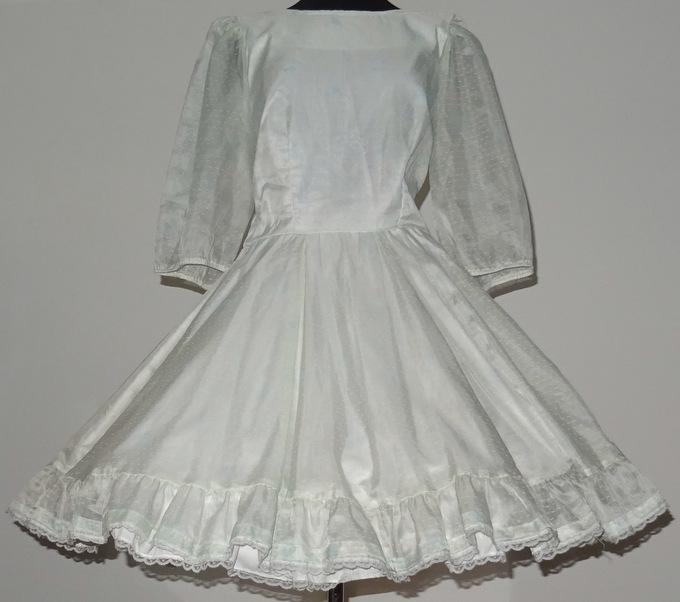 wunderschönes Kleid in zartem lindgrün mit leichtem Blüten-Muster in hellblaurunder Halsausschnitt hinten 52 cm langer Reissverschlussdas Oberteil ist weiß gefüttertin dem sehr weitschwingenden Rock ist das weiße Futter wie eine Art Petticoat eingearbeitetunten 9 cm Volant verziert mit weißer Spitze durch das weiße Futter erscheint das Kleid mehr in weiß changierenddas Kleid hat ebenfalls ein 9 cm breites Volant, verziert mit weißer Spitzedie Ärmel haben eine Länge von 43 cm und sind nicht gefüttertMaterial:65 % Polyester35 % Cottonsehr guter Zustand