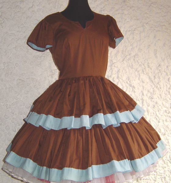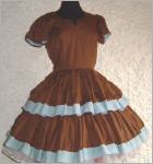 Farbe braun, hellblauUS-Grösse 1465% Polyester, 35% Cotton Reissverschluss im Rücken (50 cm) kurze Ärmelchen 5,5 cm breite hellblaue Borte die 1. Stufe überlappt die 2. Stufe