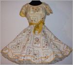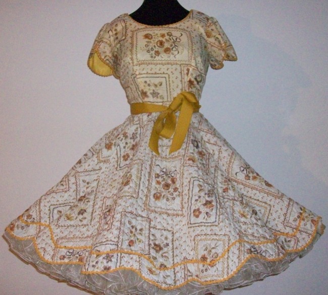 Kleid in beige mit braunen Blüten Oberteil gefüttert runder Halsausschnitt mit gelber Zackenlitze raffiniert geschwungene Ärmelchen (16 cm) mit gelber Zackenlitze Bahnen-Rock in wattiertem Stepp hinten 49 cm Reissverschluss unten in geschwungenen Bögen doppelt verziert mit gelber Zackenlitze der Gürtel ist ein 4 cm breites Ripsband