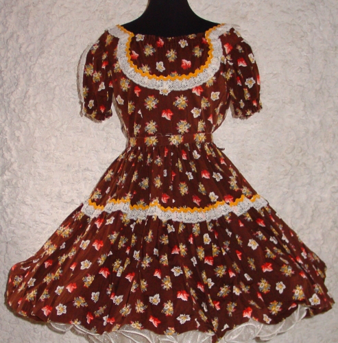 Farbe braunMuster: Blumensträusse und Ahornblätterweisse Spitze und gelbe Zickzacklitze am Dekollete, Ärmel und Rockhinten Reissverschluss 42 cmBindegürtel und passender Herrenschal