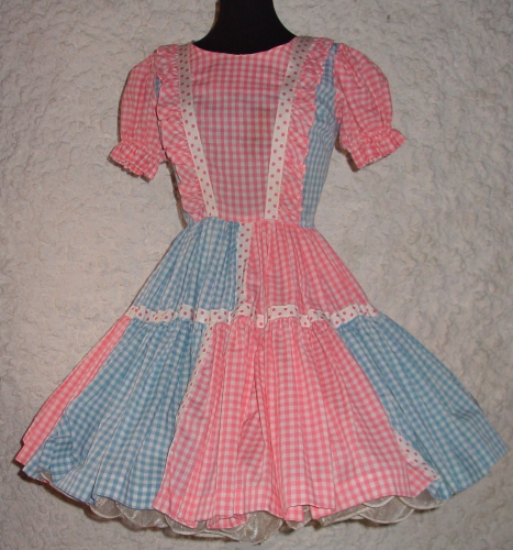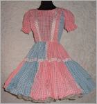 blau/weiss und rose/weiss kariertes Kleidchenmit kurzen Puffärmelchenam Oberteil und am 2-Stufen-Rock mit 2 cm breiter Borte mit rosa Punkten verzierthinten 44 cm Reissverschluss