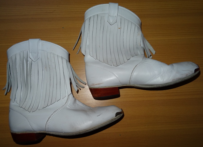 weiße Lederstiefelette weiches Leder vorne Metallkappe verziert mit weißen Lederfransen Schafthöhe 21 cm + Absatz 2,5 cm Schaftweite 28 cm breiteste Stelle über dem Halux 7 cm Länge 24 cm