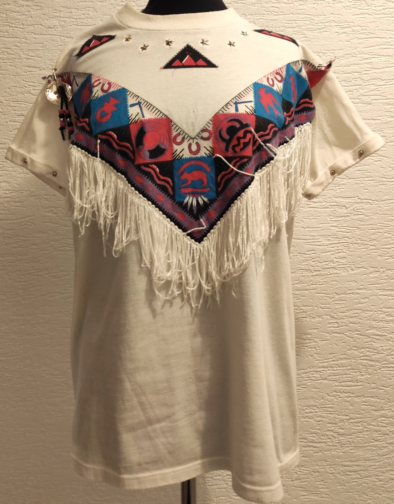 ein V-förmiges Indianermuster mit 8cm Breite, darunter befinden sich außerdem 10cm lange Franzen in weiss