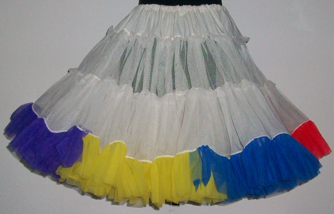 weisser Petticoat1-lagig in 2 Stufen plus 9 cm bunte Rüsche in den Farben gelb - blau - koralle - grün - rot - purplegut erhalten 100% Nylon