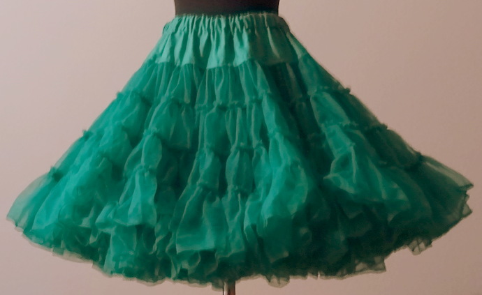 smaragdfarbener Organdy-Petticoat2-lagig, 4-stufig1 mal höhenverstellbarGummibund durch Knopf verstellbarMaterial:100 % Nylonguter Zustand