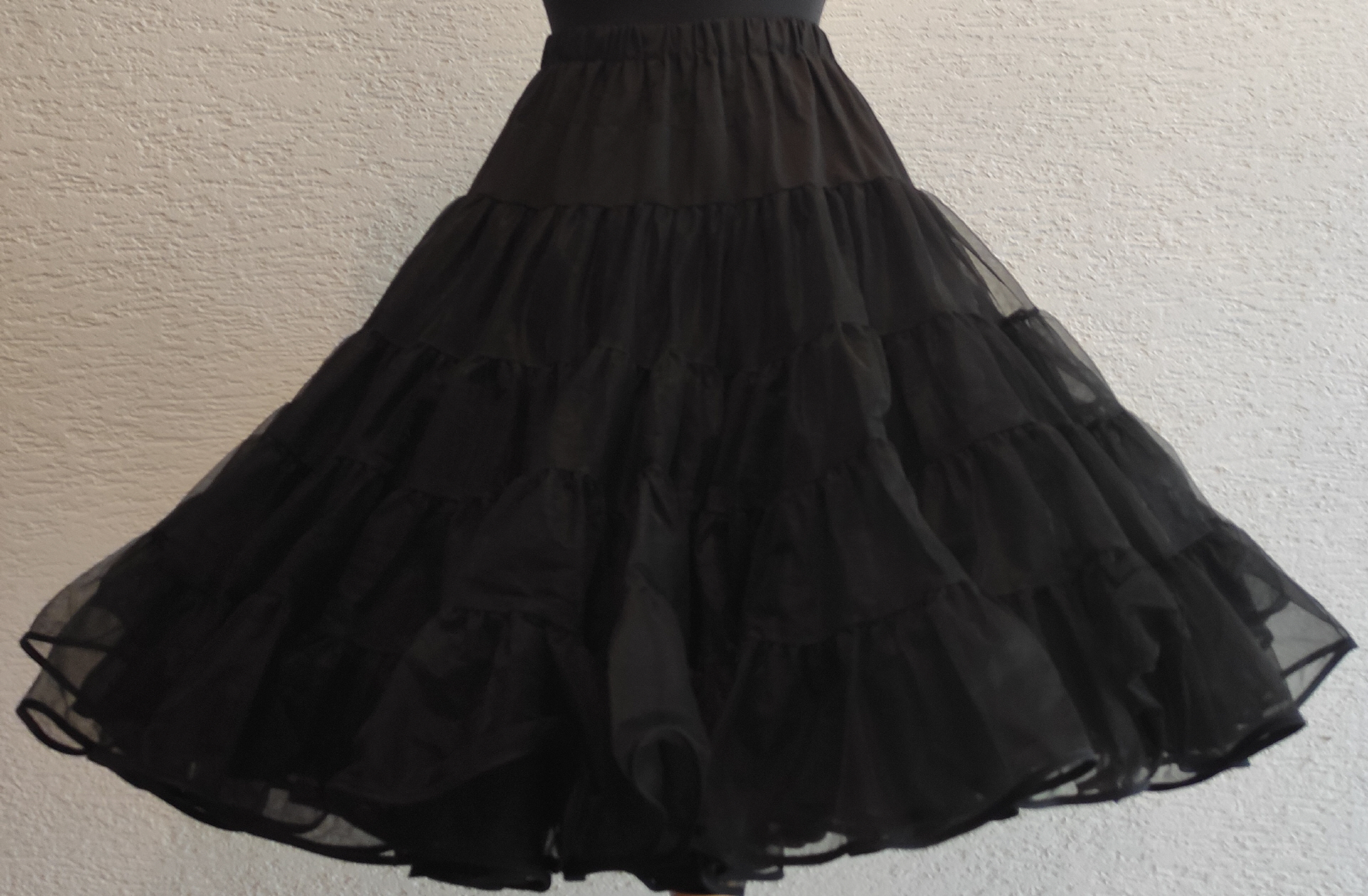 schwarzer Petticoatsehr weiches Organdy3-lagig, 4- stufigdie mittlere Lage ist in Net-Material zur Stabilität des Petticoatsjede Lage ist von einem Satinbändchen eingefasst3 x höhenverstellbarGummiband ist durch Knopf enger zu machensehr guter Zustand