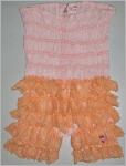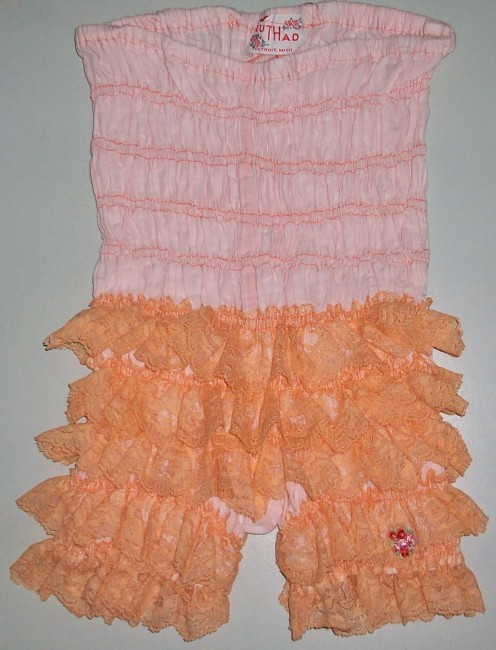 Farbe rosé mit heller orangefarbener Spitzedürfte Grösse S seindie einzelne Spitze ist 5 cm breit5 Stufen Spitze7 cm Beinchenmit Ruthad-RöschenTaille 60 cm - 98 cm sehr guter ZustandMischgewebe
