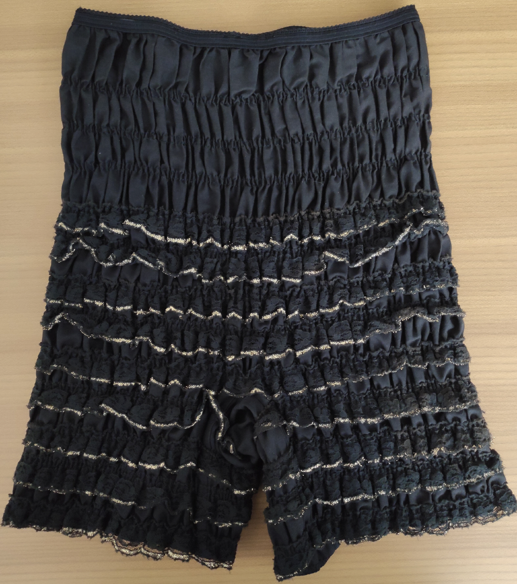 schwarze Pettipants mit 9- Stufen Rüschedie Rüsche ist mit Gold verziertBeinansatz: 10 cm Maße: Taille: 60 cm bis 82 cm Schenkel: 46 cm - 54 cmsehr guter Zustand!