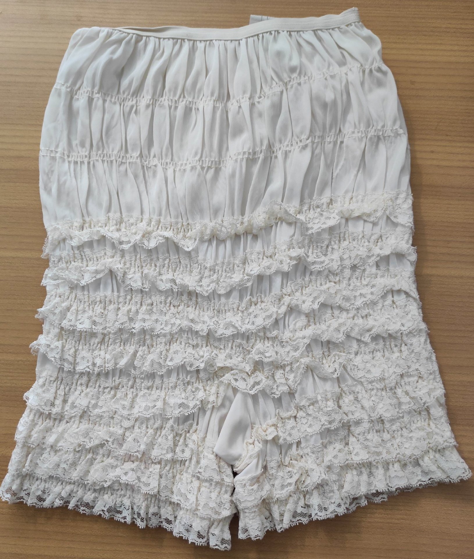 Pettipants eierschalfarben-weiß (Malco Modes). Small. Mod. N248-Stufen RüschchenMaße:Beinansatz: 7 cmTaille: 62 cm bis 90 cmSchenkel: 48 cm bis 60 cmSmallNeuwertig