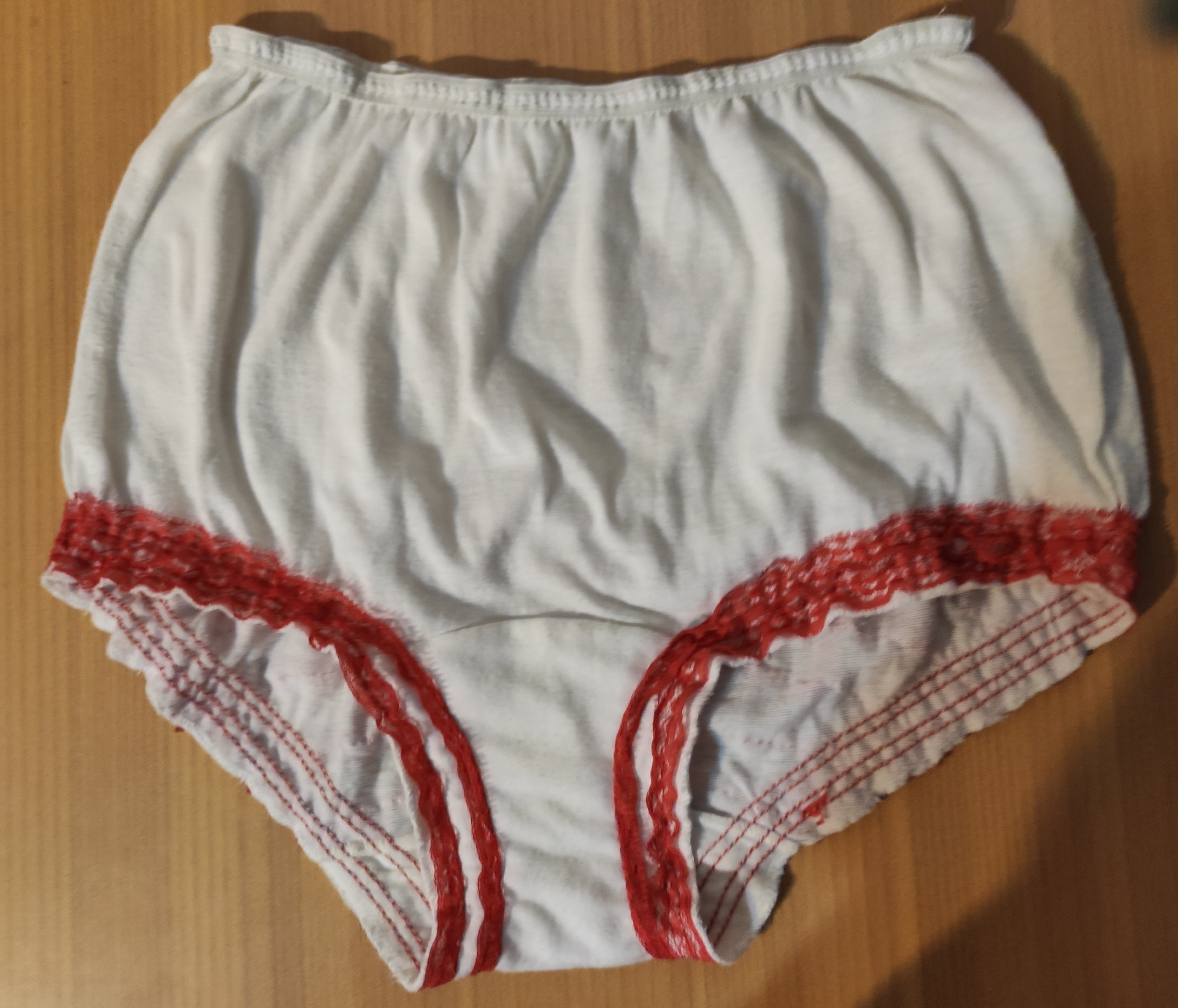 weisse Pettipants in Slipform mit roten Rüschchen 5-Stufen Rüschchen am Hinterteil und 1 Stufe um die BeinausschnitteCotton SlipMaße: Taille: 68 cm bis 84 cm Schenkel: 50 cm bis 54 cm guter Zustand