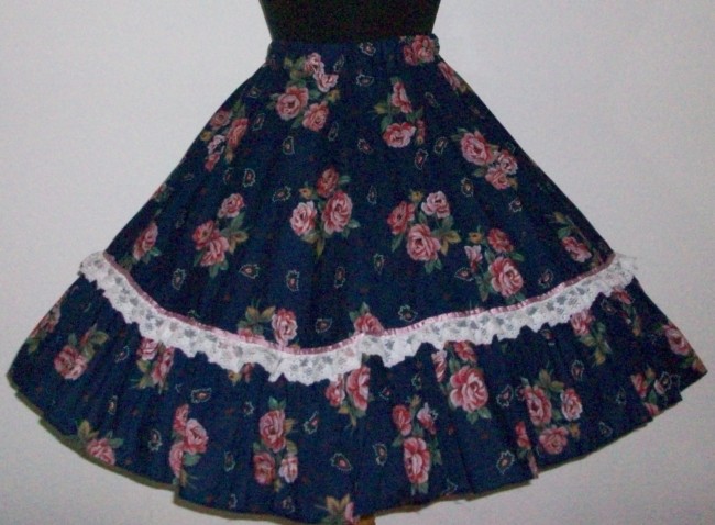 dunkelblauer Rock mit rosa Rosen18 cm Volant, verziert mit weisser Spitze und altrosa SatinbandGummibundguter Zustand