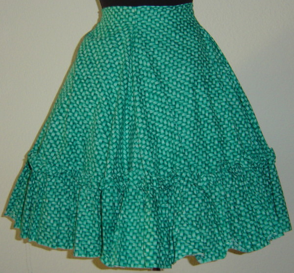 türkisfarbener Rock mit Flechmusterdruck18 cm breiter Volantüber dem Volant ist eine 2,5 cm breite Rüschehinten 22 cm Reissverschlussder Bund lässt sich nur minimal dehnen
