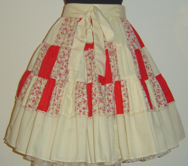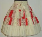 Patchwork in zartem beigerotes Blumenmuster und rote Einsätzestarrer Bundhinten Reissverschluss 21 cmrechts und links angebrachter Bindegürtel zum binden auf der Rückseite