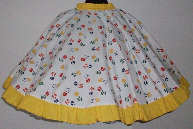 weisser Rockmit Blüten und Blättern in rot/gelb/blauunten 6 cm gelber Volant4 cm breiter, gelber Gummibundneu65% Polyester, 35% Cotton