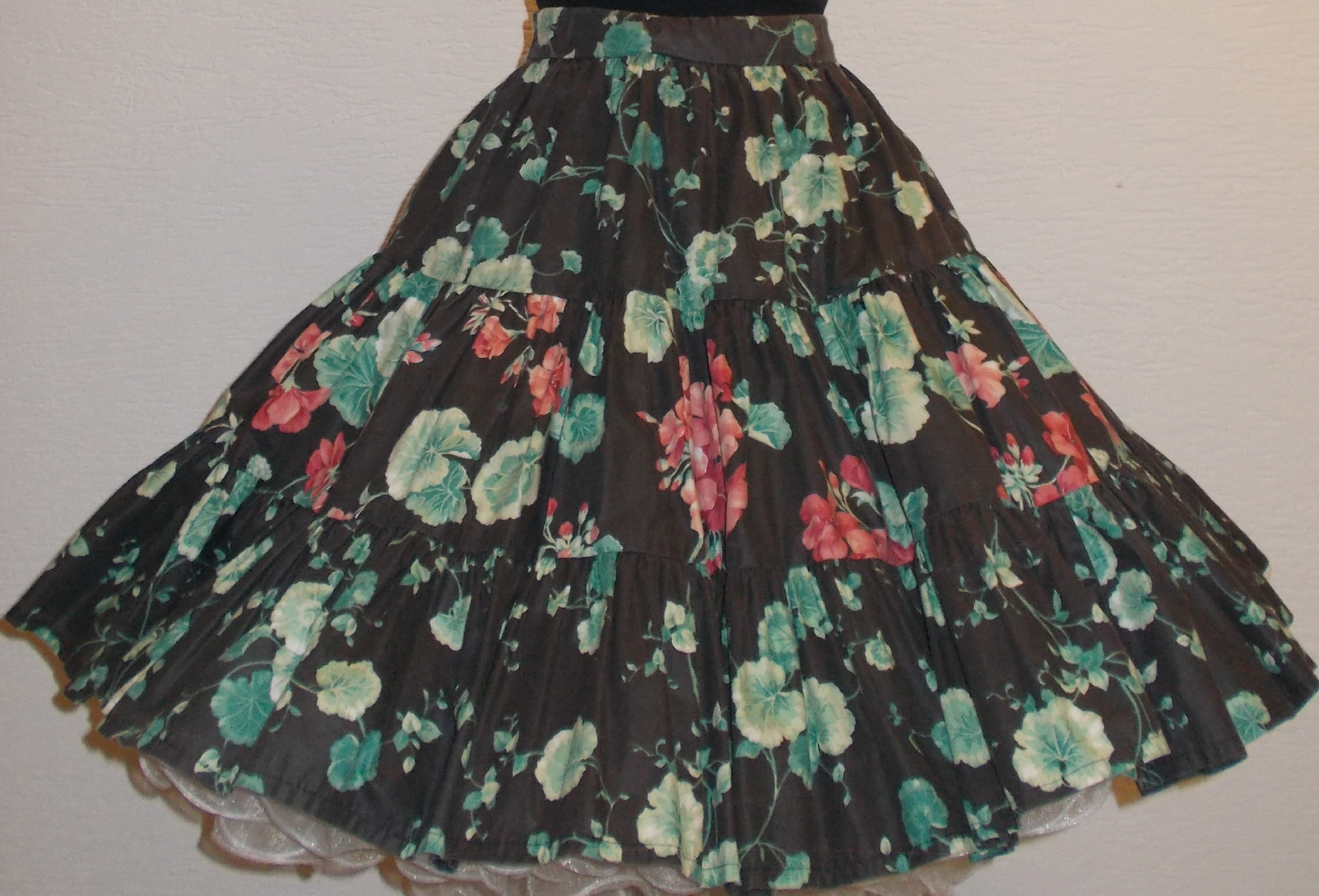 antrazitfarbener 3- Stufenrock der Marke Call it Fancy mit Blumenmusterauf dem antraziten Grund befinden sich grüne Blätter und rote Blütenhinten 15 cm Reisverschluss3 cm breiter Gummibundguter Zustand!