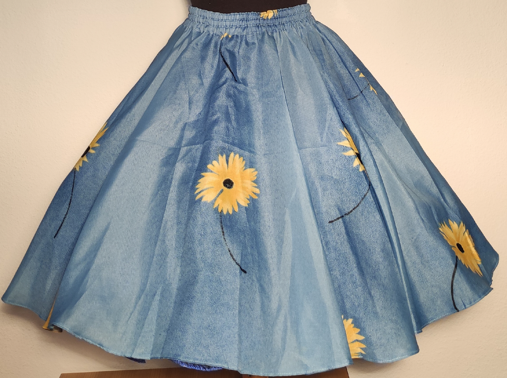 weitschwingender Tellerrock in hellblau, Tupfenstreuung in dunklerem Blau und gelben Blumenpflegeleichtes Material4 cm Gummibund