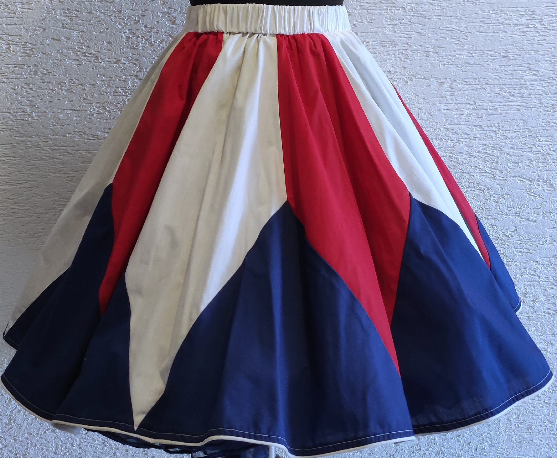 sehr interessant in geometrischen Mustern zusammengestellter sehr weit schwingender Tellerrock in den Farben blau, weiss, rotGummibund von 3,5 cm TOP Zustand