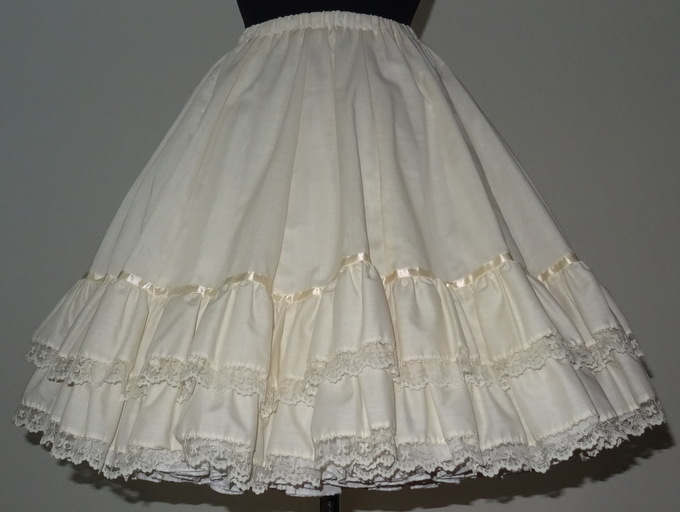 cremefarbener weitschwingender Tellerrock2,5 cm breiter Gummibund unten mit doppeltem Volant (je 11 cm), jeweils verziert mit cremefarbener Spitze oberhalb der Volants 1 cm breites cremefarbenes SatinbandMaterial:MischgewebeTOP Zustand
