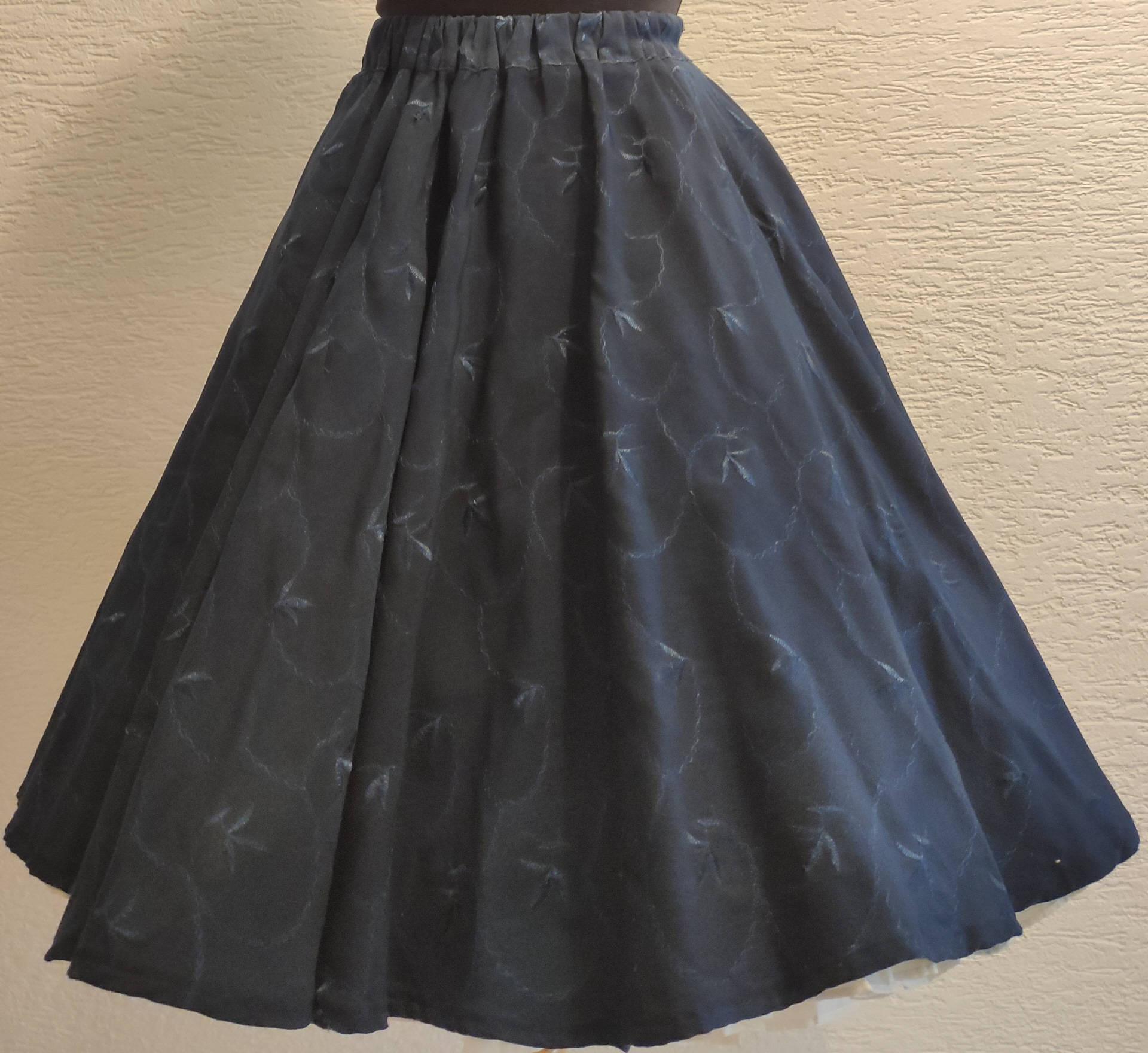 dunkelblauer weitschwingender Tellerrock mit augesticktem Blättermuster und RankenGummibund in 3,5 cm Breite