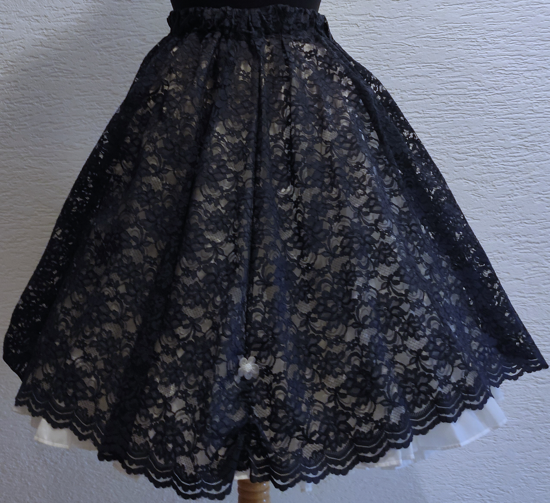 dunkelblauer weitschwingender Rock in 6 Bahnen aus dunkelblauer Spitzejede Bahn ist verziert mit einem weissen Blümchen und weissen Perlender Rockabschluss ist in geschwungener SpitzeGummibund in 4,5 cm BreiteNEU